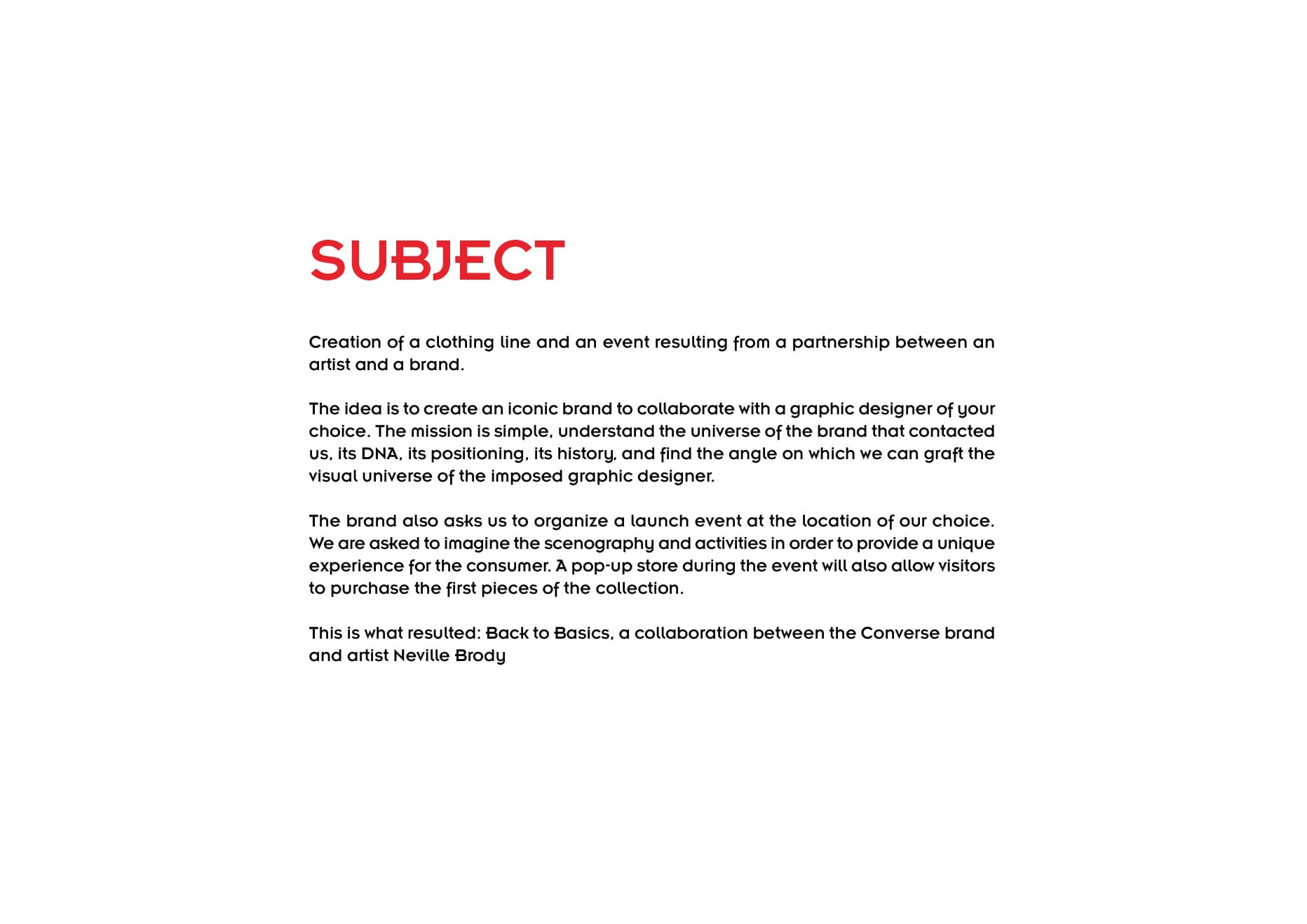 Dans le cadre d’un projet fictif, nous avons travaillé sur une collaboration entre une marque iconique et un graphiste imposé. Notre mission était de comprendre en profondeur l’univers de la marque, son ADN, son positionnement, son histoire afin de définir l’angle le plus pertinent pour y intégrer l’univers visuel du graphiste.