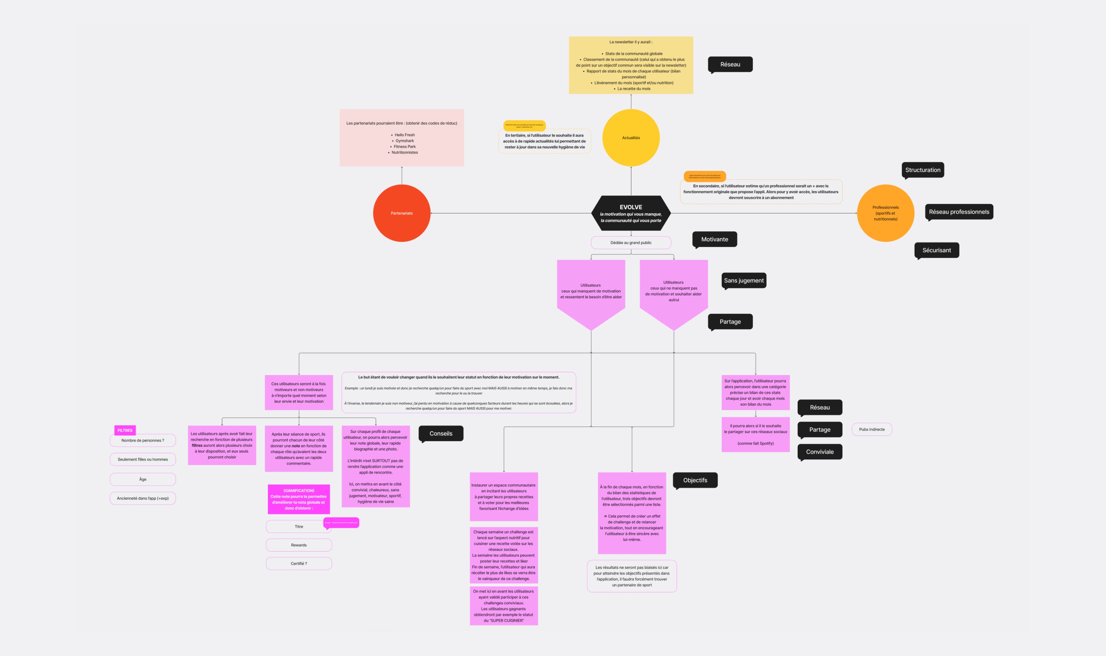 En schématisant de façon claire, Evolve est une application mobile innovante dédiée à la motivation collective dans les domaines du sport, de la nutrition et du bien-être. Conçue pour répondre à une demande croissante liée aux défis de sédentarité et de manque de motivation, elle connecte deux types d’utilisateurs : les Challengers, motivés et prêts à accompagner, et les Rookies, en quête d’énergie et d’encouragement.