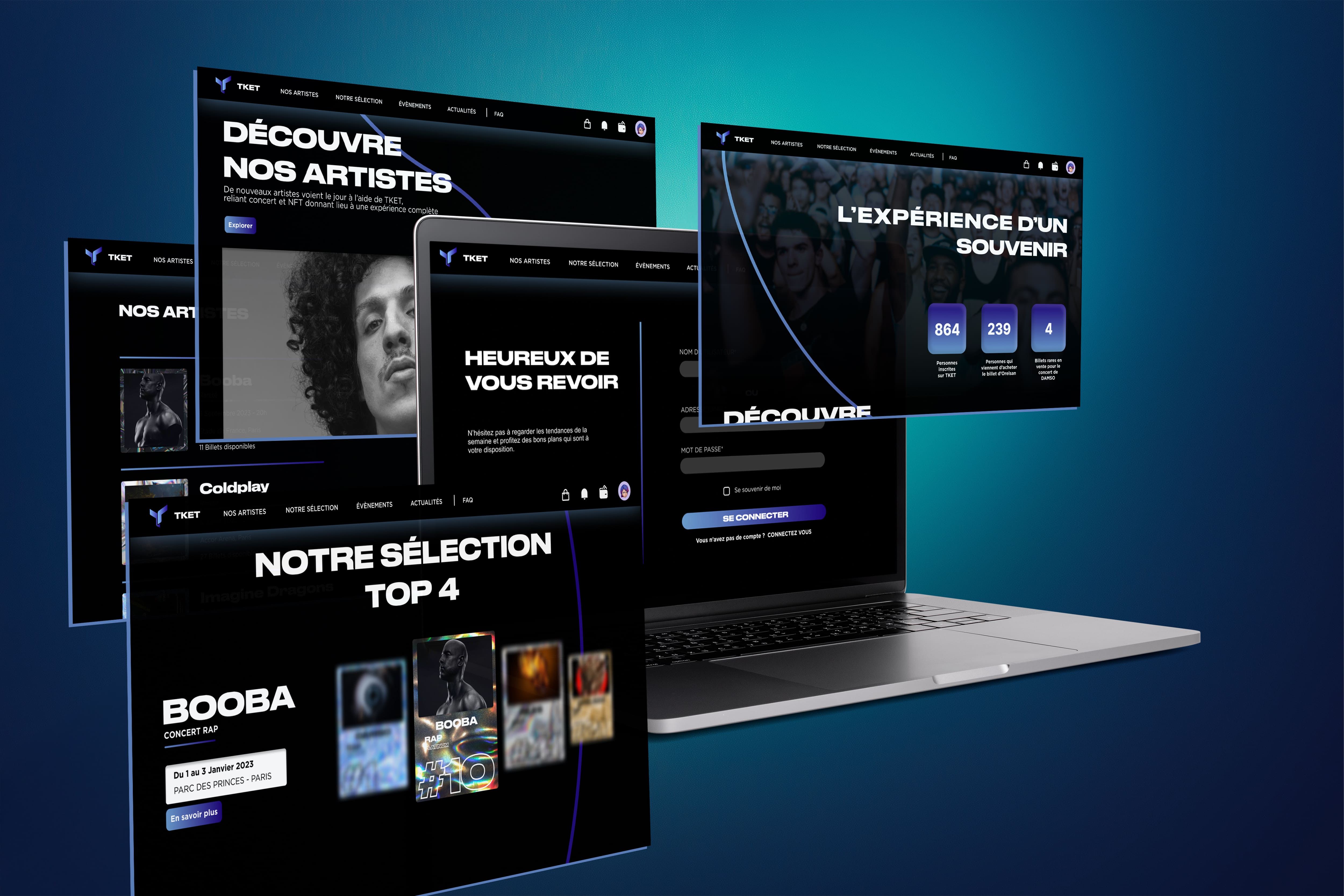 Ce projet consistait à concevoir l’identité visuelle de TKET, une startup innovante souhaitant repenser la billetterie en ligne via les NFT et la cryptomonnaie. L’objectif était de traduire visuellement les valeurs de TKET à travers une interface cohérente, futuriste et ancrée dans l’univers musical.
